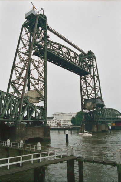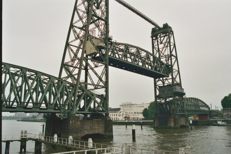 De hefbrug over de Koningshaven, gezien vanaf het Noordereiland en vanuit westelijke richting , nog in vol bedrijf.