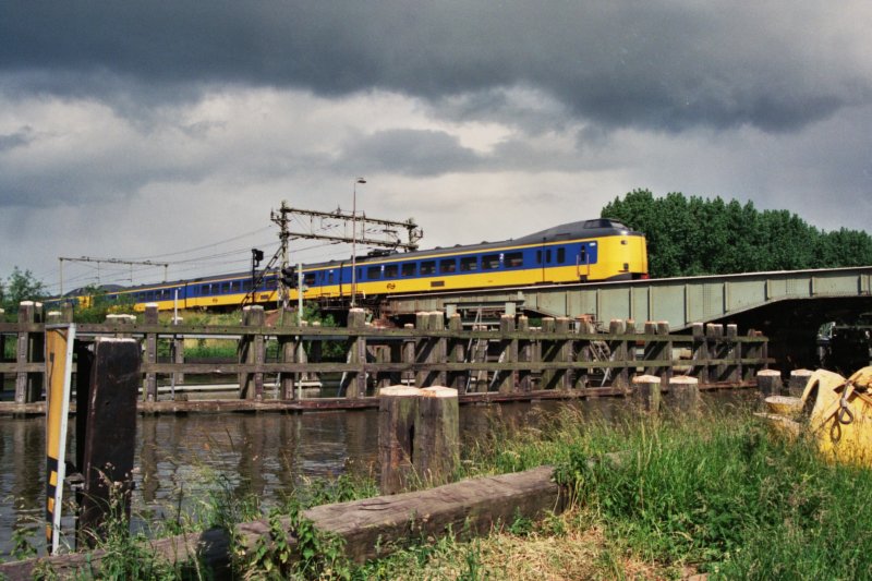 Een kijkje op de nieuwbouw vanonder de oude draaibrug over de Gouwe. Gouda, 31 mei 1989.