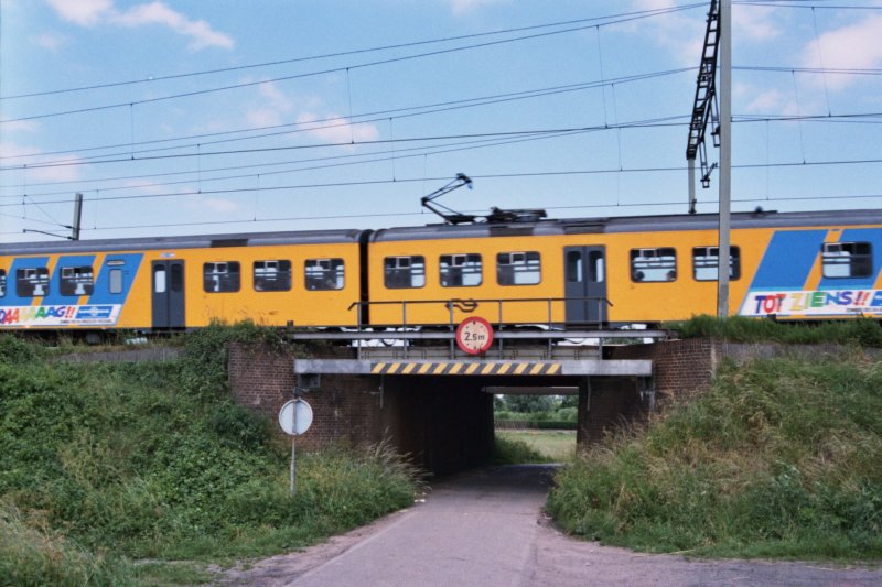 Nogmaals nieuw en oud. Over de oude brug passeert net stroomloos een koploper. Waddinxveen, 12/6/88.