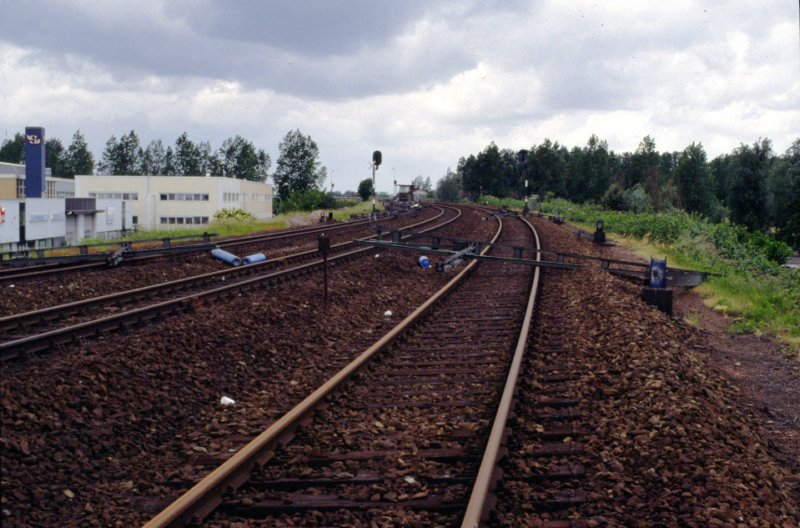 Een wat onwezenlijk gezicht: zonder draad in westelijke richting. Geheel rechts het vm. enkelspoortje van de Gouwelijn.