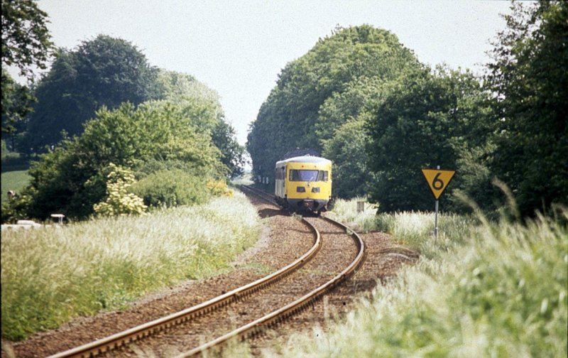 Doorkomst van DE-II 179, de boog in het Eyserbeekdal uit komend t.h.v. Eys, de ABk voorop en - zoals het bordsein aangeeft - met een maximum snelheid van 60 km/u in de richting Simpelveld (Spv) uit 't beeld verdwijnt. Eys/Wittem, ca. 11.18 uur.