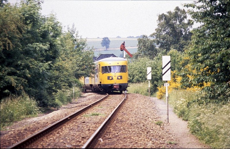 Op weg naar Aken passeren we vandaag voor één van de laatste keren het buiten gebruik zijnde deel van de Miljoenenlijn. Links zien we hier de reeds in 1988 verlaten tak richting Kerkrade. (Simpelveld-aansluiting)