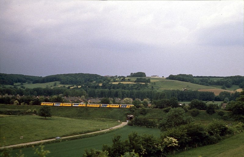 Trein 3740 in volle glorie t.h.v. Wijlre/Fromberg. Stelnummer 179 voorop; ziehier Zuid-Limburg èn de Miljoenenlijn in al haar pracht! 30 mei 1992, ca. 16.26 uur.