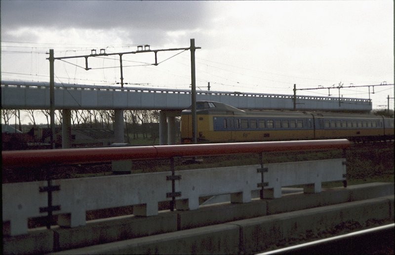 Eindelijk mag het Haagse deel van trein 1751 doorkomen. Van de dienstregeling klopt echter helemaal niets meer! Waddinxveen, 't Weegje, 18/11/90.