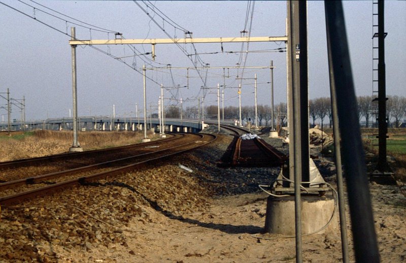 Een close-up van de spooraanleg van de "haagse" fly-over wachtend op de aansluiting als hoofdspoor, waarna het benedentraject richting Gd vervalt, terwijl rechts in beeld een gemengde goederentrein, getrokken door een 1100 vanuit de richting Rt zich richting Gd e.v. spoedt en eveneens via de nieuwe hefbrug de Gouwe oversteekt.