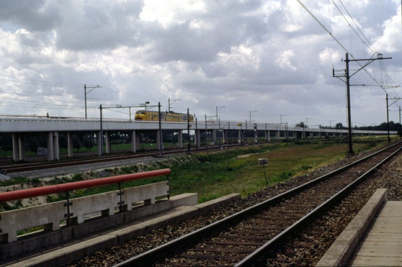 Het bouwwerk is voltooid: een Plan V uit Rt is op weg naar Gd over het nieuwe tracé. Waddinxveen, 't Weegje, mei 1992.