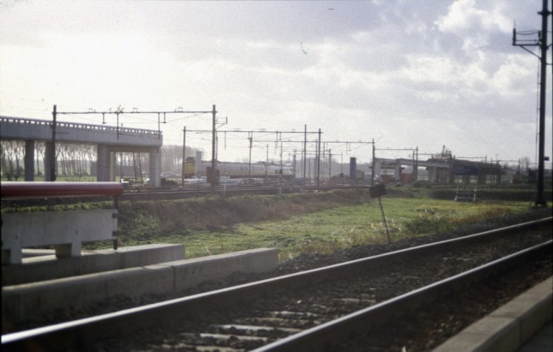 Het Haagse deel van trein 1751 (ICM-mat) moet wachten (geheel rechts) tot het Rotterdamse deel van trein 9844 de splitsing is gepasseerd in de richting Rt. De 'fly-over' t.b.v. een ongelijkvloerse kruising vordert gestaag. Waddinxveen, 't Weegje, 18/11/90.