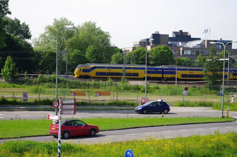 Overzichtsplaatje: op spoor 5 wacht een VIRM op het vertreksein richting Utrecht, op spoor 8 staat 2x plan V gereed voor vertrek in westelijke richting.